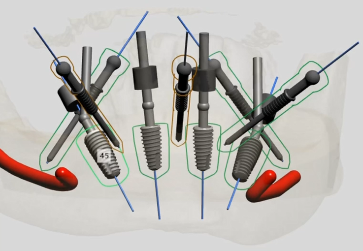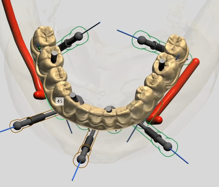During the preoperative planning phase, it was identified that one implant (marked ’45’ in the illustration) would require placement at a significantly steeper angulation than is typical for this type of procedure, necessitating careful prosthetic planning and the use of an appropriately angled abutment.