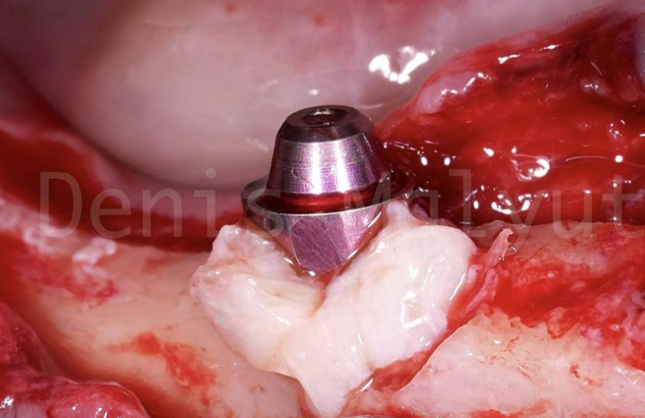 As shown in the image, the 45° angled abutment was positioned higher above the bone level compared to the other abutments. To achieve proper soft tissue integration and to harmonize the gingival contour around the abutment, a connective tissue graft was placed (see image below).