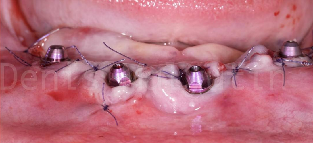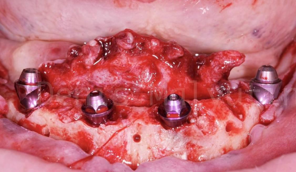 - Placement of four dental implants in the anterior mandible, where bone density was sufficient and the risk to the mandibular nerve and other critical anatomical structures was minimal.