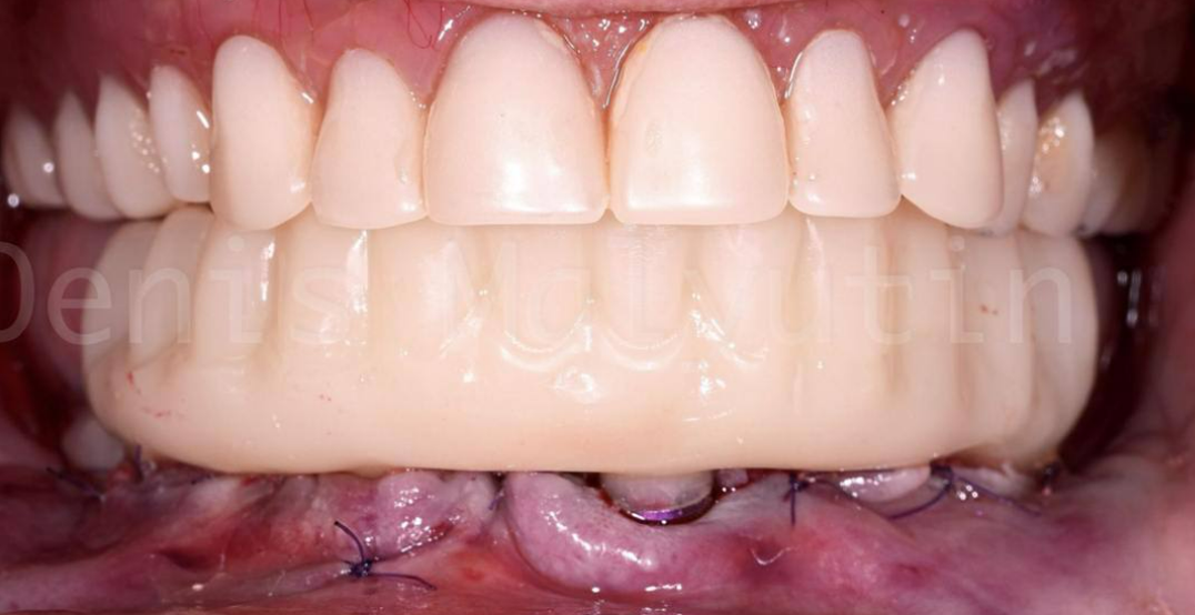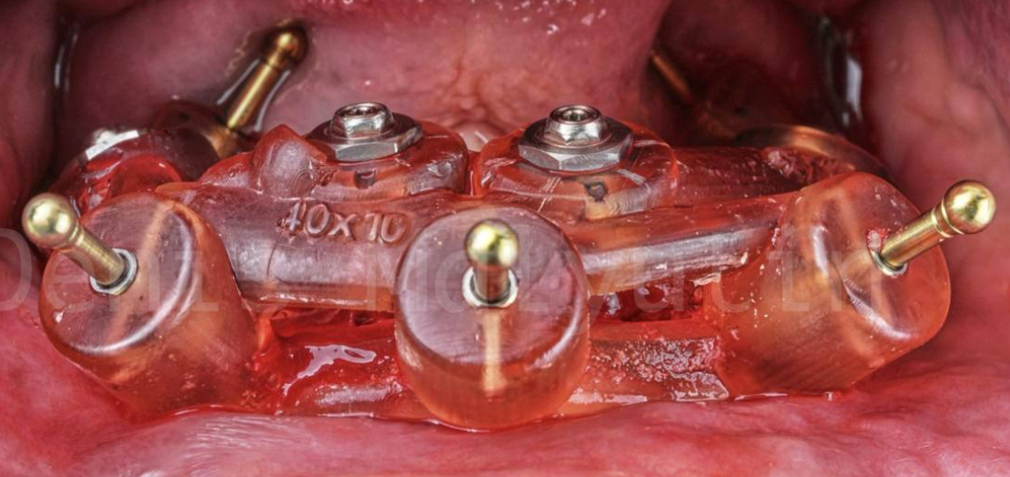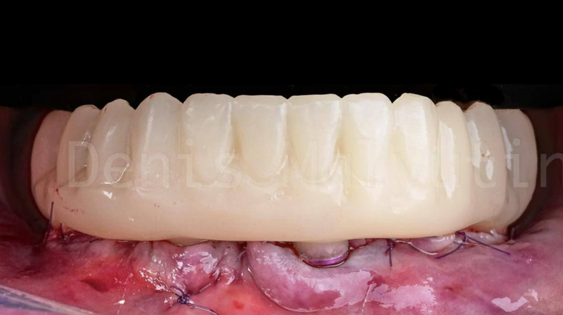 - Fabrication and placement of a screw-retained full-arch restoration supported by these four implants: initially a temporary prosthesis, followed by a permanent restoration after osseointegration.