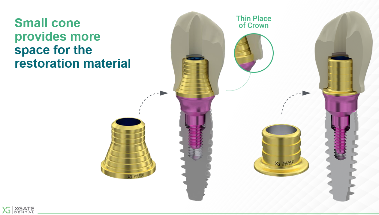 On the left is a classic multi-unit abutment with a standard cone; on the right is the MUA V-Type with an ultra-low profile. This design allows for increased material thickness at the base of the restoration, enhancing strength and ensuring a smooth emergence profile favorable for soft tissue attachment.