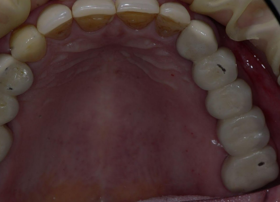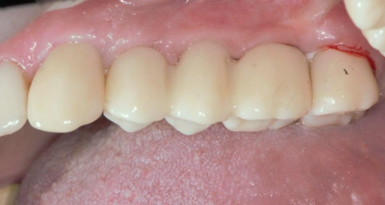 The screw-retained zirconia bridge and the crowns on teeth 13 and 17 show a precise fit, as seen in the photo below.