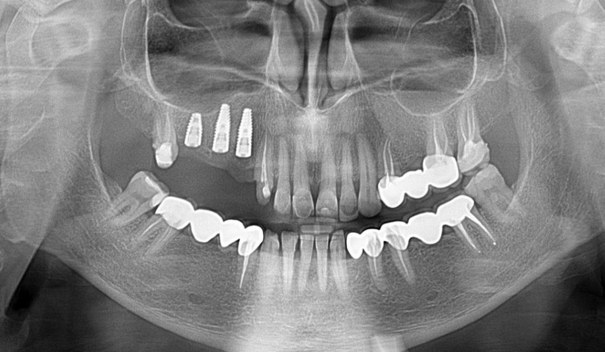 Three Straumann BL® implants with a standard conical connection were placed in positions 14, 15, and 16. Notably, a short implant was selected for position 16 to avoid penetrating the maxillary sinus and perforating the Schneiderian membrane (see radiograph below).