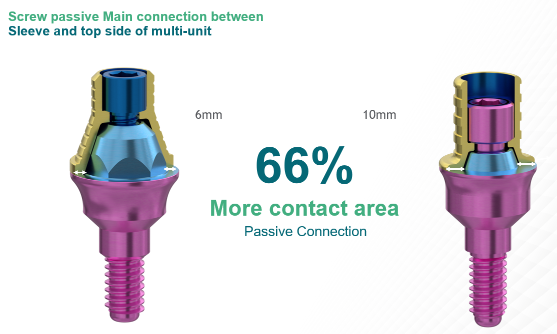 In addition, the MUA V-Type sleeve connection offers increased stability compared to classic multi-unit abutments. This is due to the larger contact surface area between the sleeve and the abutment base: while a classic MUA has a contact area of 6 mm², the V-Type offers 10 mm².