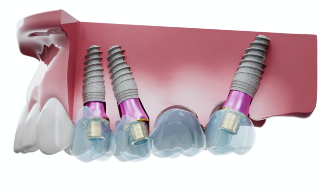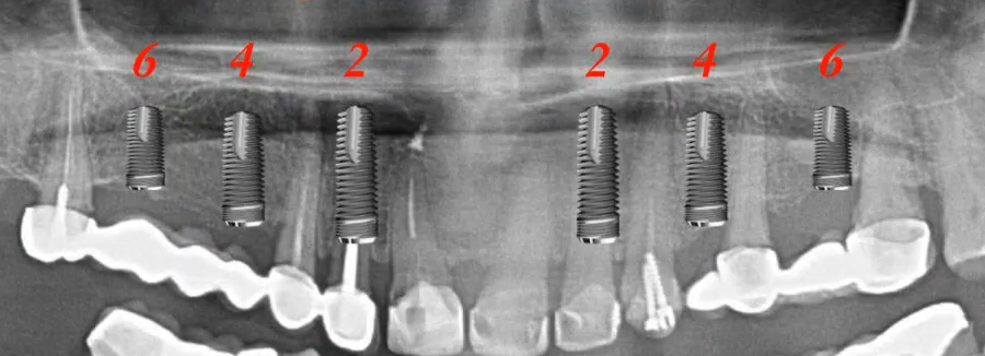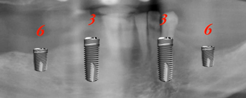 The number of implants is not a rigid requirement. If, with a classic placement for teeth 3 and 6, the distance between the implants significantly exceeds 2 cm, the number of implants can be increased, for example, by placing one in the center. This may be the case for patients with a very large frame.