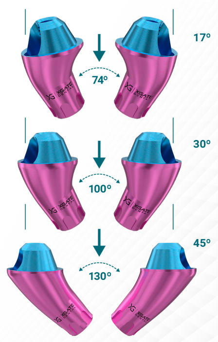The standard is considered to be MUA with angles of 17°, 30° and 45°, which allow for compensation of implant deviation from 74° to 130° (see illustration below).