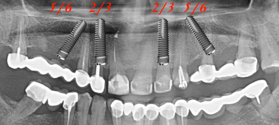 However, doctors often encounter bone deficiency in the posterior regions, which shifts the formula slightly and implants are placed in the 2 and 5 tooth positions. This is slightly worse, but it is still possible to create a 12-tooth prosthesis, provided the basic rules are followed: