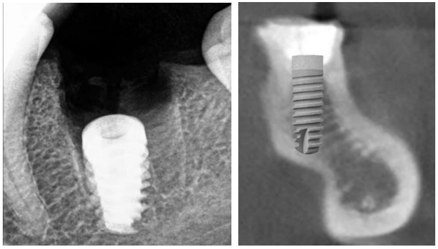 If it’s the upper jaw, the implant’s apex may penetrate the maxillary sinus. If it’s 2-3 mm, sinus lifting is generally not necessary. The main thing is that the bone thickness is sufficient to secure the implant. Standards and indications for sinus lift are a separate topic, so we won’t discuss it in detail.The lower jaw is at risk of damaging the mandibular nerve or artery.In any case, you should not make mistakes like those in the illustrations below.