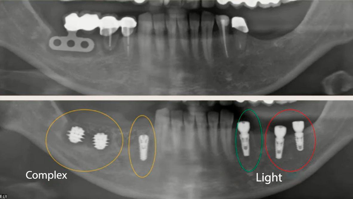 Implant placement in the posterior mandible: a simple case (quadrant 3) versus a complex case (quadrant 4) requiring removal of an old bridge and plate-form implant. YouTube / Dr. Kamil Khabiev / Dental Guru Academy