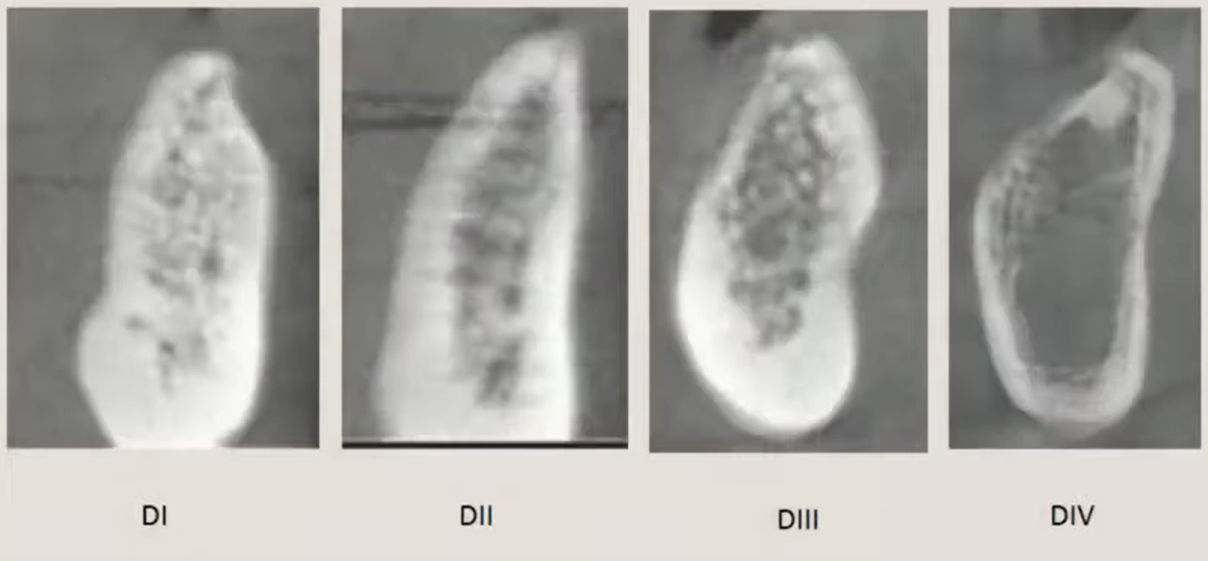 - Type D4: The cortical layer is extremely thin or virtually absent (average 0.5 mm). The cancellous bone is very soft, demineralized, and barely visible on X-rays.