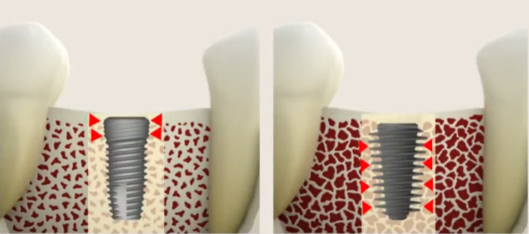 The difference in fixation principles between cortical (left) and cancellous (right) implants. YouTube / Dr. Kamil Khabiev / Dental Guru Academy