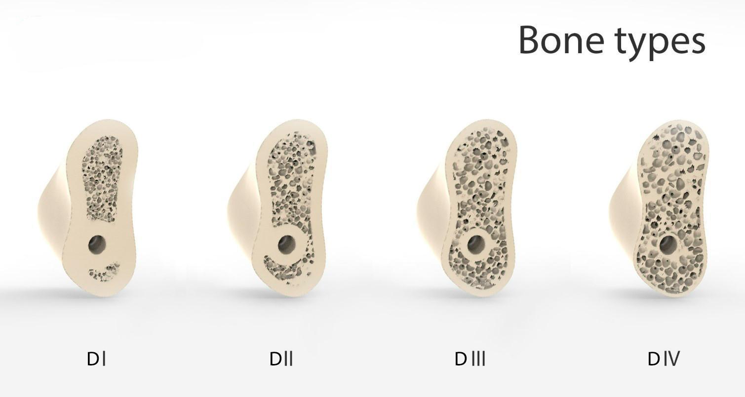 - Type D4 Bone: This is analogous to drywall or dense Styrofoam. Even in these materials, a secure hold is achievable with fasteners that have wide, blade-like threads and a sufficient diameter. Corresponding implant designs also exist.