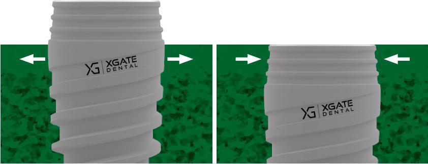 Unlike conventional cortical implants where the neck is flared, the neck of the XGate implant features a reverse taper. This innovative design reduces compression in the cortical bone. As the implant is inserted, its widest part, located below the neck, gently expands the osteotomy. When the implant is fully seated, the narrower neck relieves this pressure. The natural elasticity of the bone then allows the cortex to close in and gently grip the implant neck. This simple yet brilliant design provides secure engagement without the risk of over-compression. XGate Dental implants are ideal for both flapless surgery in D1-D2 bone and for immediate placement protocols, thanks to their self-tapping apex.